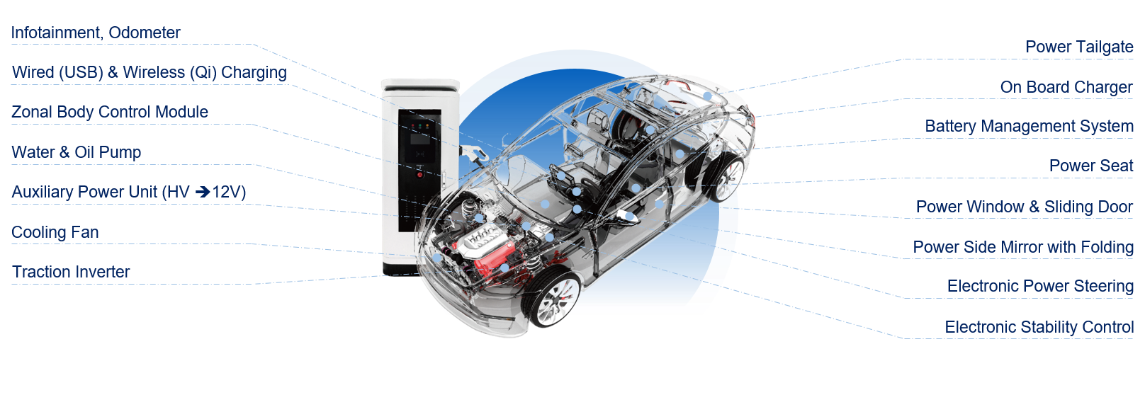 捷捷微電 車規(guī)級產(chǎn)品 (MOSFET, TVS) 廣泛應用于車燈照明及新能源汽車電源應用。 車規(guī)級 MOSFET 通過先進的工藝制程,提供優(yōu)異的電氣特性如 RDS(ON) 和 Qg,非常適合工作頻率較高的開關(guān)電源應用。目前產(chǎn)品涵蓋低壓 40 ~ 60V、中壓 100 ~ 150V、以及超結(jié)高壓 650V 以上各類應用。 車規(guī)級 TVS 采用獨特的 CLIP 結(jié)構(gòu),相對于傳統(tǒng)的 A+B 結(jié)構(gòu),可以避免虛焊,減少芯片應力,提供高可靠性。在性能上實現(xiàn)卓越的鉗位能力、漏電流小、快速的響應速度,同時滿足 AEC-Q101 等級測試規(guī)范。